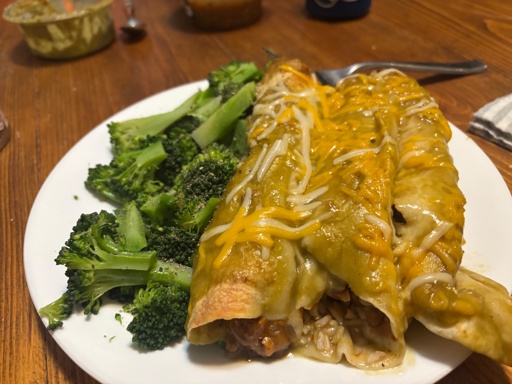Made some seitan “ground beef” cooked some squash, onions and mushrooms up. Mixed it all together with a bit of refried beans to stick it all together, wrap em up, slather with green enchilada sauce, top with cheez. So damn good.