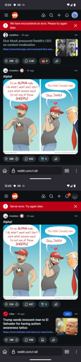 Screenshots of reddit.com/r/all on mobile as it appeared immediately after loading (did not scroll), taken at 12:34 and 12:40 PST; look what suddenly disappeared from the #1 post spot! That’s a rather specific “server error”…