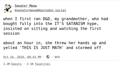 arrow-up11.03Karrow-down1imageSatanic Mathpawb.socialThefuzzyFurryComrade@pawb.social to RPGMemes @ttrpg.network · 4 months agomessage-square103linkfedilinkfile-textcross-posted to: lemmydirectory@lemmy.dbzer0.com
