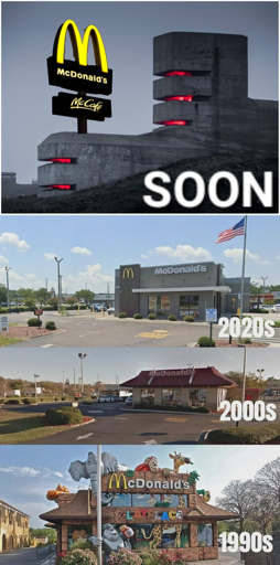 minus-squareteslasaur@lemmy.worldlinkfedilinkarrow-up7·4 months agoLooks about the same in Sweden. Wood panels with green accents together with the golden arches