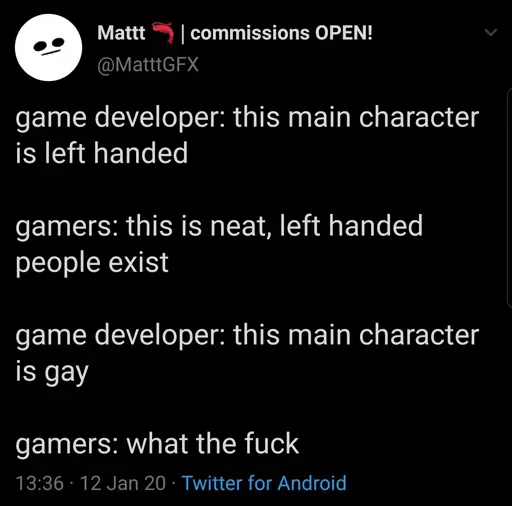 minus-squareSomething Burger 🍔linkfedilinkarrow-up5·17 天前Broke: This character is ambidextrous because we just flipped the sprite Woke: Link is right-handed because we flipped the entire game