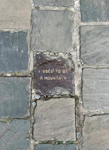 Years ago, I found this cobblestone on the street in Brussels with the golden inscription “I USED TO BE A MOUNTAIN.” Like a speech bubble rising from a choked rock. After all these years, I still haven’t been able to find out who made it—there’s no record of it anywhere as a listed artwork. I see it now as a poetic intervention by an anonymous city dweller.