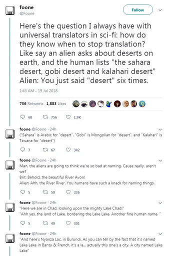 Here’s the question I always have with universal translators in sci-fi: how do they know when to stop translation? Like say an alien asks about deserts on earth, and the human lists “the sahara desert, gobi desert and kalahari desert” Alien: You just said “desert” six times.