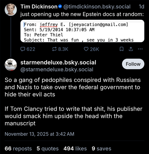 minus-squareVeryInterestingTablelinkfedilinkarrow-up6·3 hours agoLet’s get rid of the deep state! ~Puts deep state in place instead. See there really is a deep state!