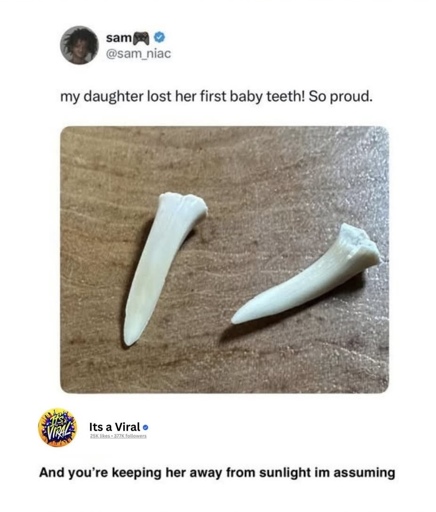 arrow-up1526arrow-down1imageBaby teethlemmy.worldickplant@lemmy.world to Lemmy Shitpost@lemmy.world · 27 days agomessage-square11linkfedilink cross-posted to: vampires@lemmy.zip