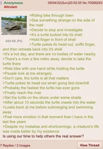 (A 4Chan “green-text”, titled “Altruism”, with a close-up photograph of a turtle on the pavement)