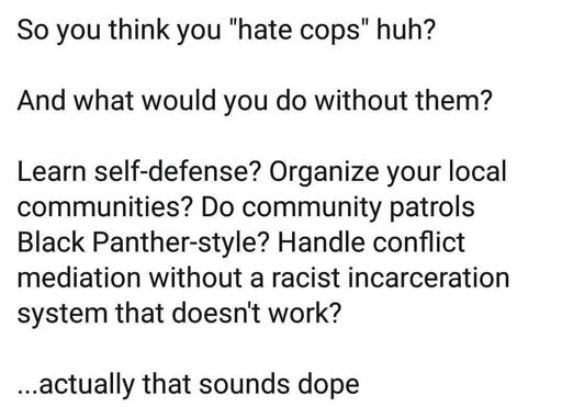 compostgoblin@slrpnk.net to solarpunk memes@slrpnk.netEnglish · 8 months agoWho needs cops anyway?slrpnk.netimagemessage-square108linkfedilinkarrow-up11.06Karrow-down149