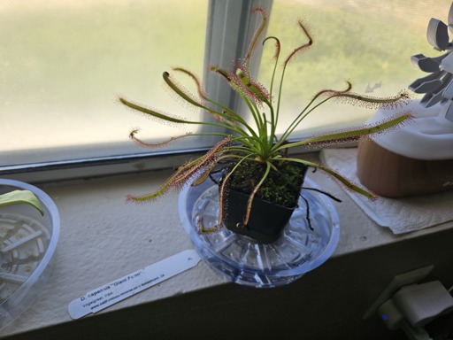 I can’t emphasize enough a sunny spot. This window faces southwest and so it gets 8 hours of direct sun. This helps with growth and also makes the mucus shine which seems to attract the bugs.