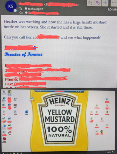 Real talk it was probably Heather works under her and asked “hey what do I do when a large picture of mustard appears on my screen” and Director Of Finance said "reboot and if it’s still there I’ll let so-and-so know from IT, then emailed it off to so-and-so from IT directly instead of entering a ticket