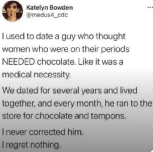 My first wife didn’t like chocolate and had crippling PMS, as in, bent double in bed with cramps, ass in the air kinda suffering. I think her man was onto something.
