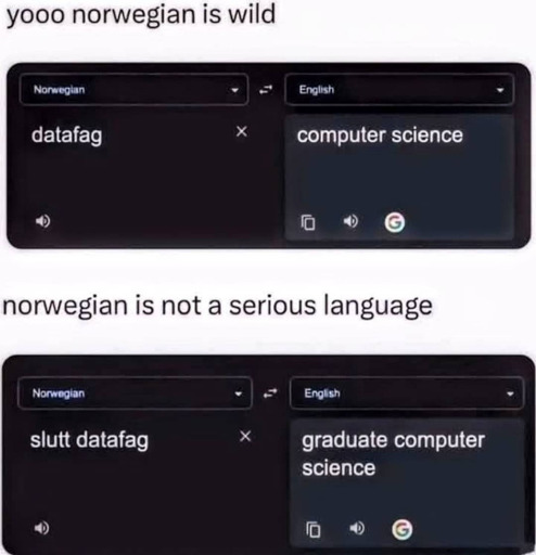 This being said, slutt datafаg is not really a normal way to say “graduate computer science”. To me it reads more like commanding someone to “quit computer science!”, more like dropping out than graduating, right? A more normal phrasing in my eyes might be, I dunno, å fullføre utdanningen sin i datafаg, “to complete one’s education in computer science”.