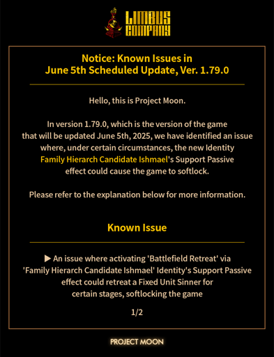 LeGaosaure@lemmy.blahaj.zoneM to Project Moon - Welcome to The City@lemmy.cafeEnglish · 6 months ago[Limbus News] Notice: Known Issues in June 5th Scheduled Update, Ver. 1.79.0clan.fastly.steamstatic.comimagemessage-square2linkfedilinkarrow-up14arrow-down11file-text