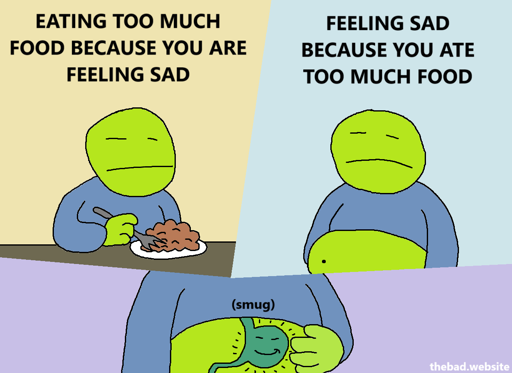 [a character is looking sad in front of a dish full of nondescript brown food] EATING TOO MUCH FOOD BECAUSE YOU ARE FEELING SAD