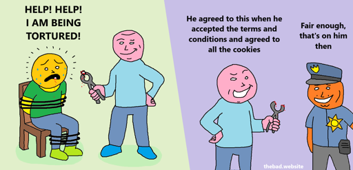 [pink, smiling, talking to a cop, still holding the bloody pliers] He agreed to this when he accepted the terms and conditions and agreed to all the cookies