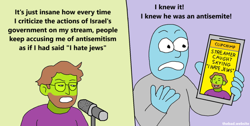 [streamer talking into a microphone] It’s just insane how every time I criticize the actions of Israel’s government on my stream, people keep accusing me of antisemitism as if I had said “I hate jews”
