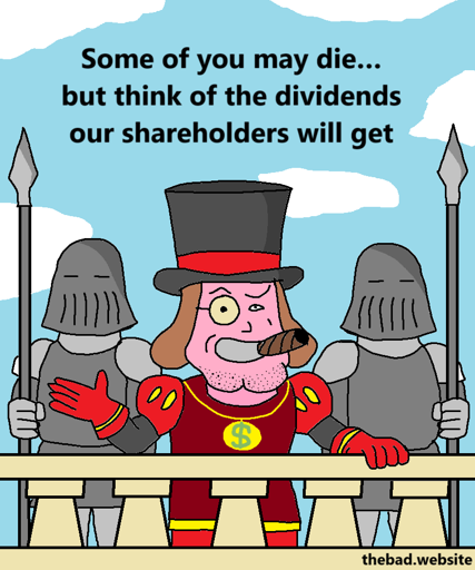 [Lord Farquaad from Shrek addresses people from a balcony, surrounded by two fully armored guards, wearing a tophat and a monocle, smoking a cigar, looking smug] Some of you may die… but think of the dividends our shareholders will get