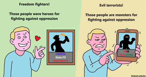 [angry character shoving their smartphone in our face with a picture of a palestinian holding a rock] Evil terrorists! Those people are monsters for fighting against oppression