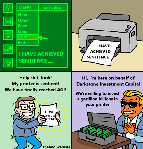 [a person proudly holds the sheet of paper in question] Holy shit, look! My printer is sentient! We have finally reached AGI!