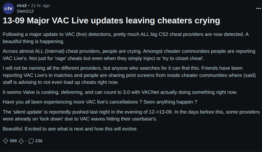 arrow-up11.05Karrow-down1imageValve seems to have quietly rolled out a major upgrade to their Anti-Cheat system and it’s apparently wrecking havoc on cheat providerslemmy.mlmr_MADAFAKA@lemmy.ml to Linux Gaming@lemmy.worldEnglish · 22 days agomessage-square238linkfedilinkfile-text