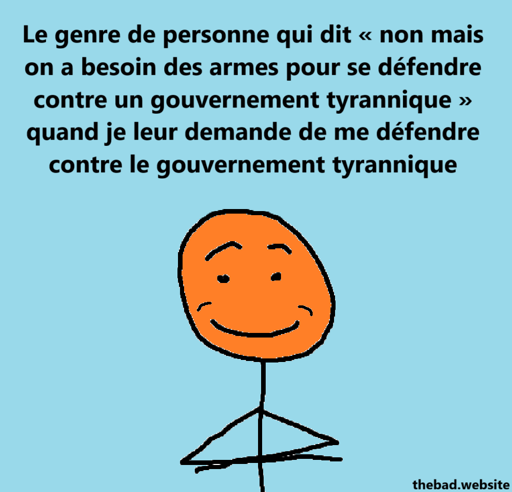 Le genre de personne qui dit « non mais on a besoin des armes pour se défendre contre un gouvernement tyrannique » quand je leur demande de me défendre contre le gouvernement tyrannique