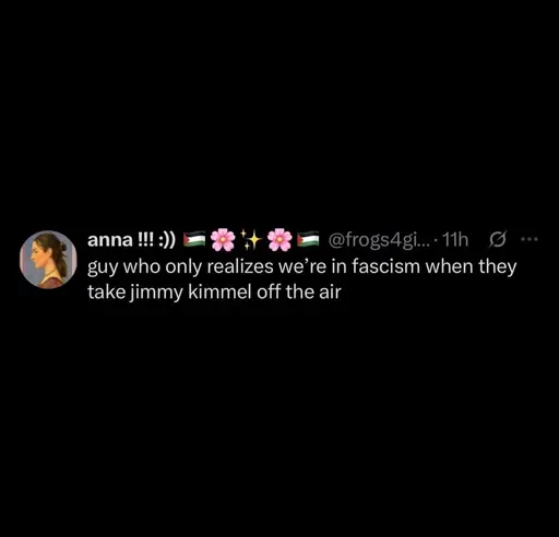 For real. And not to mention, the Kimmel thing is like, a very serious step forward in a way other things have not been. I’m not saying other bad stuff hasn’t happened, for sure. But it’s not unreasonable for this to be the straw that breaks the camels back for some people. I hate Kimmel, always have, but it was surprising to see the media control phase unfolding so openly and suddenly. This IS crossing a new line.