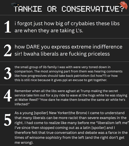 goat@sh.itjust.worksM to MeanwhileOnGrad@sh.itjust.worksEnglish · edit-216 days agoThis game made Tankies mald, let's play again! TANKIE OR CONSERVATIVE? Can you guess who the Tankies are and who the Conservatives are? Winner gets a random Steam key!sh.itjust.worksimagemessage-square29linkfedilinkarrow-up155arrow-down18