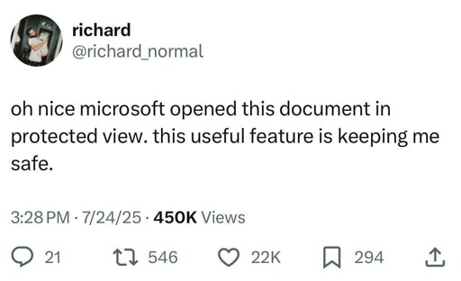 The annoying part is, they could check if the file even contains malicious code. But they don’t and instead default to protected mode, even for basic files.