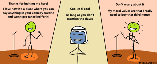 [blue, in a keffiyeh, staring at green] Cool cool cool As long as you don’t mention the slaves