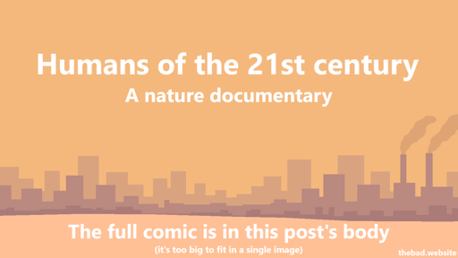 Was MSPainting some 21st century hellscapes and thought I could use them as a background for a satirical take on a bleak documentary about us, in graphic novel format. So here it is.