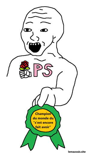 Un personnage dans le style “wojak”, emblasonné de la fleur du Parti Socialiste Français, t’offre fièrement une médaille sur laquelle est écrit « Champion du monde du “s’est encore fait avoir” »