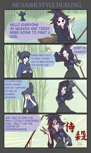 This is part of the legend of the fight between Miyamoto Musashi and Sasaki Kojiro, supposedly the top Japanese swordsmen of their time, Kojira died. It’s an illustration of the difference between bujutsu (martial technique/art) and budo (martial way). Bujutsu is only concerned with winning whatever the cost, regardless of honor or fairness, budo is about becoming a better person, so honor matters.