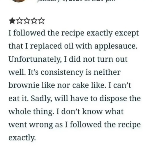 My brother gave our mom a recipe and she said that she followed it exactly and it turned out horrible. My brother questioned her and bit by bit, it turns out that she literally modified every single step, from the cooking method to the ingredient (singular) used. Some people just isn’t aware what they’ve done.