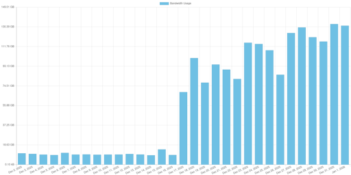 Turns out, on December 17, my bandwidth usage jumped dramatically - see the attached graph.