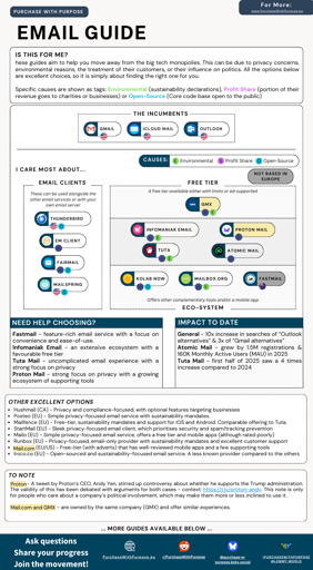 There is also a community-driven, open-source site ( https://purchasewithpurpose.eu/category/email/ ) that aims to make this even easier. This includes screenshots, ratings and a larger feature list.