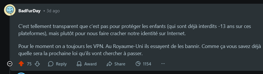 Si j’ai hâte! Je pense qu’on devrait aussi autoriser les backdoors de l’état dans les messageries chiffrées et avoir des caméras à reconnaissance faciale un peu partout et tout ça sans mandat parce que la sécurité des enfants n’attend pas!