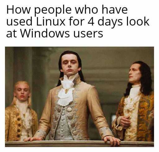 ekZepp@lemmy.world to linuxmemes@lemmy.worldEnglish · 19 days agoPeasants...lemmy.worldimagemessage-square172linkfedilinkarrow-up11.63Karrow-down112