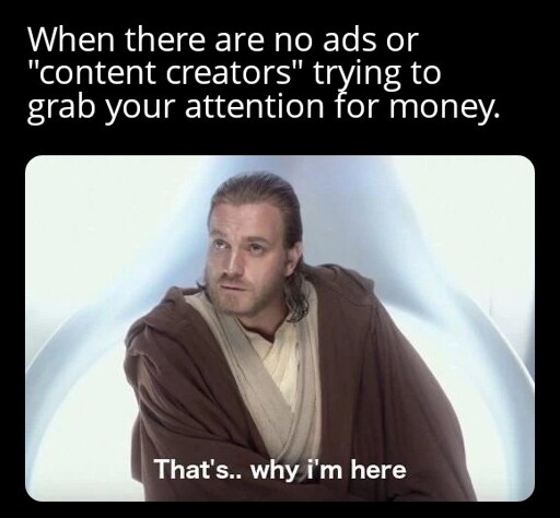 No ‘content creators’ trying to grab your attention for money, though… That can never last. The more popular the service gets, the more such people will come to it, looking to take advantage of the wider audience available here. And, honestly, the fediverse might be even weaker against that. While some instances might make rules against it, they’ll go to instances that don’t have rules against it, or poorly moderated instances, or they’ll make their own new ones. You can always block them, sure, but new ones will pop up faster than you can block them if it gets popular enough. At least as long as Capitalism lasts, whenever there’s a large group of people, others will come to try to sell things to those people or extract money from them in other ways.