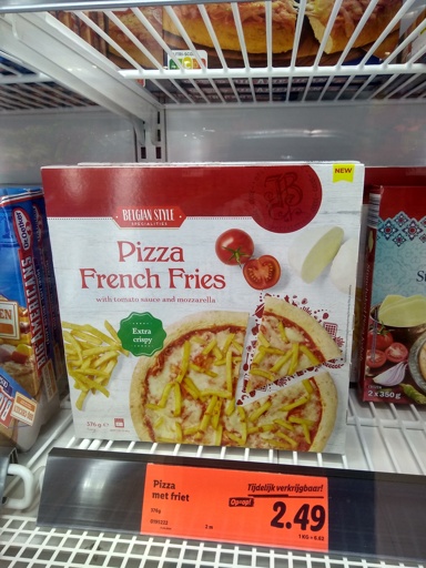 Where I am from in the Netherlands near the German border, it’s mostly margherita, bolognese, quattro stagione, 4 cheeses or Hawaii, nothing like this…surprised there was Dutch language on the box.