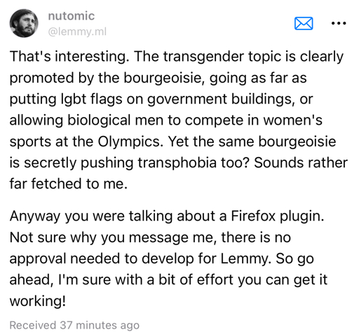 arrow-up1175arrow-down1image[Transphobia Warning] Nutomic’s Stance on Transgender Peoplepinlemmy.caPugJesus@lemmy.world to MeanwhileOnGrad@sh.itjust.worksEnglish · 2 years agomessage-square76linkfedilinkcross-posted to: tankiejerk@lemmy.worldfediverse@lemmy.worldfediverselore@lemmy.ca