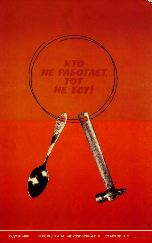In the USSR work is a duty and a matter of honor for every able-bodied citizen, in accordance with the principle: “He who does not work, neither shall he eat”.